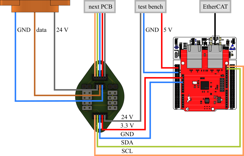 The optional PCB (mounted opposite each encoder in the joint) handles the modular communication of the encoders with the test bench via I2C. It comprises an AD-Converter (ADC) ADS122C04 to convert the analogue output of each encoder into a digital signal. Each PCB is configured as an I2C target (slave). As the I2C controller (master) serves a NUCLEO-F401RE development board, that is located outside the robot. Attached to it is a Bausano EasyCAT-shield that enables a connection from the NUCLEO board to the EtherCAT bus for communication with the test bench.